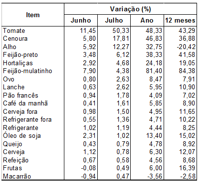 O tomate, com redução de oferta, após ter subido 11,45% em junho, chegou a ficar 50,33% mais caro em julho e, com isso, ganhou o primeiro lugar no ranking dos principais impactos, com 0,10 ponto percentual. No Rio de Janeiro, o preço do tomate quase dobrou de um mês para o outro, atingindo variação de 94,18%. O segundo maior aumento do tomate foi em Porto Alegre, atingindo 83,32%.O tomate não foi o único vilão para a alta de preços. Itens como cenoura (17,81%), alho (12,27%), feijão (6,12%), hortaliças (4,68%) e o pão francês (1,78%) também encareceram a cesta básica.