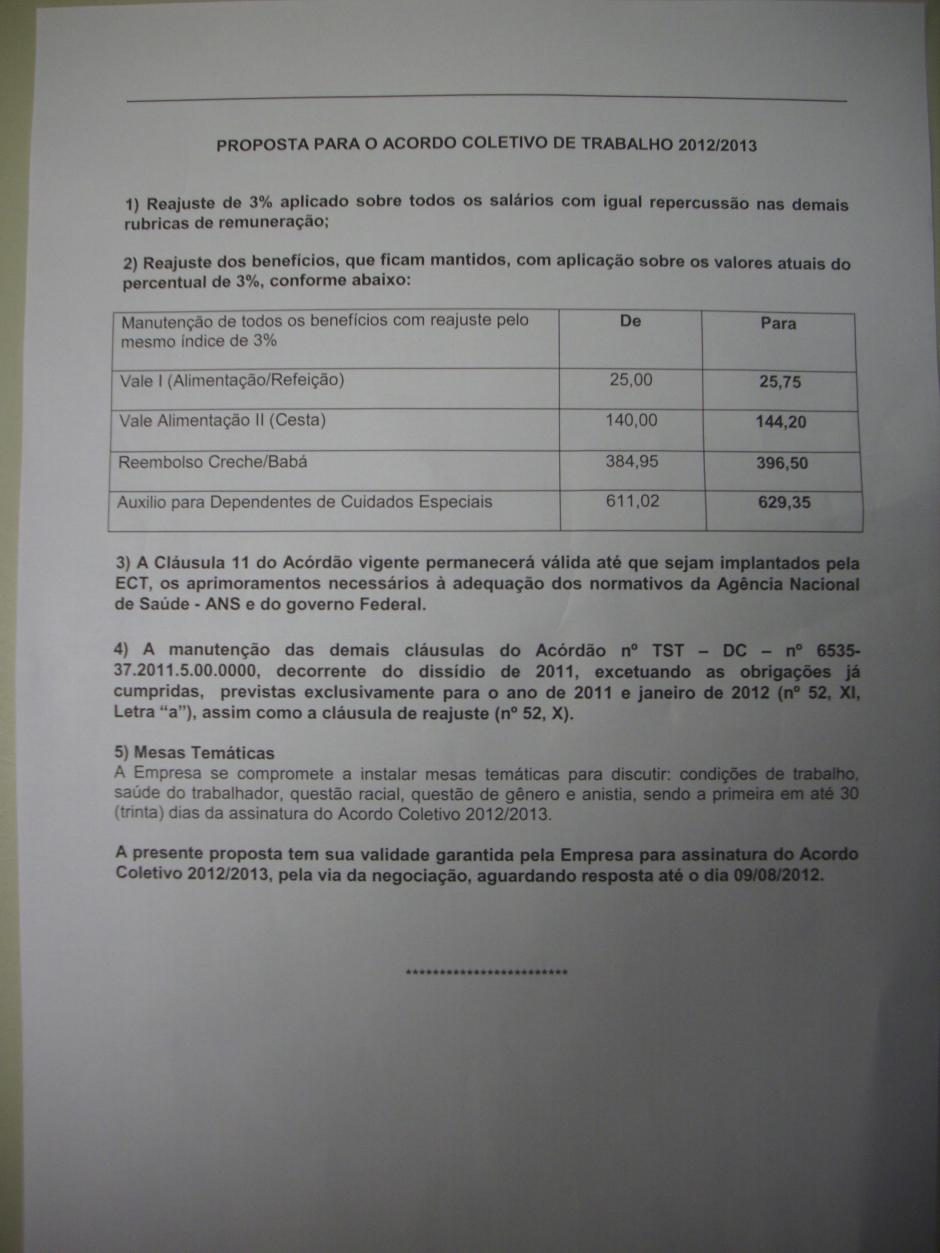 Manifestamos ainda, nosso repúdio à Direção da Empresa, que no momento de negociação apresenta uma contra proposta nociva, principalmente no tocante às cláusulas sociais, retirando e restringindo direitos conquistados com muita luta, tal qual o nosso plano de saúde.