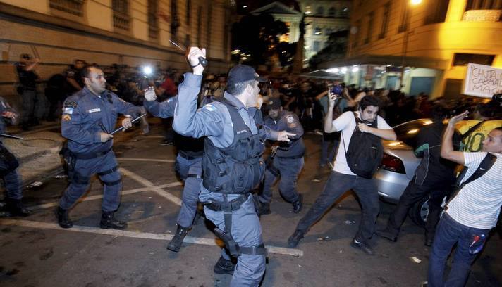 Segundo manifestantes, agora por volta das 22:15, os policiais estão batendo e tudo está sendo registrado nesse momento. O gás de pimenta começou a ser lançado assim que todos os manifestantes sairam e há relatos de disparos de taser por parte dos policiais em alguns manifestantes. Eles relatam que apanharam com cacetetes e uma das manifestantes relatou que apanhou na cara.