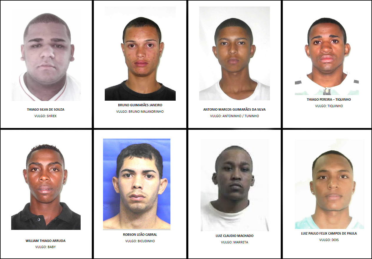 Thiago Silva de Souza, conhecido como “Shrek”, Bruno Guimarães Janeiro, “Bruno Malandrinho”, Antonio Marcos Guimarães da Silva, “Antoninho” ou “Tuninho”, Thiago Pereira, “Tiquinho”, William Thiago Arruda, “Baby”, Robson Leão Cabral, “Bicudinho”, Luiz Claudio Machado, “Marreta”, Luiz Paulo Felix Campos de Paula, “Dois”, e Marcelo Martins de Almeida (que está preso desde abril, por cumprimento de mandado de prisão pelo crime de tentativa de homicídio, cumprido pela 34ª DP Bangu. O mandado foi expedido através de investigações da 41ª).