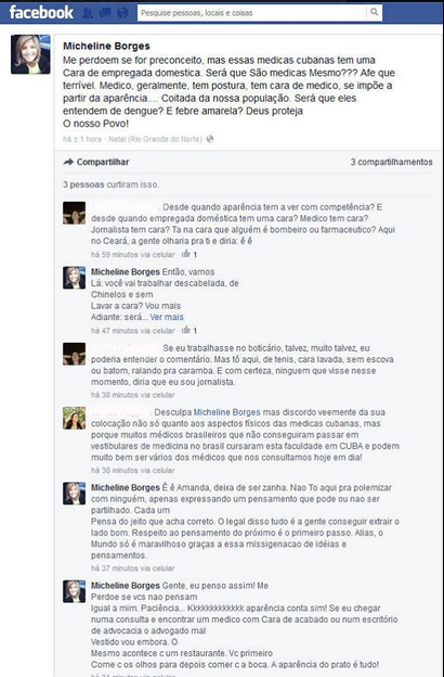 A presidente do Sindicato das Empregadas e Trabalhadores Domésticos da Grande São Paulo, Eliana Gomes de Menezes, entrou com um processo na Justiça paulista contra a jornalista Michelline Borges, que afirmou em sua conta nas redes sociais que “médicas cubanas têm cara de empregada doméstica”. Após o desembarque dos primeiros médicos estrangeiros que atuarão no país, no mês passado, a jornalista, que vive no Rio Grande do Norte, escreveu: “me perdoem se for preconceito, mas essas médicas cubanas têm uma cara de empregada doméstica. Será que são médicas mesmo?” Segundo o sindicato, a jornalista “menospreza a potencialidade das médicas cubanas e trata com desprezo e discriminação as nossas empregadas domésticas”. Com isso, a presidente da instituição entrou com um processo na Justiça pedindo indenização de R$ 27.120, por danos morais. “A questão não é a indenização. Nós queremos mostrar para essa jornalista que empregada tem orgulho da profissão, não há nenhum demérito nisso. As declarações dela foram extremamente preconceituosas. Por isso, achamos que isso não poderia passar impune”, disse a advogada Fabíola Ferrari, que representa Menezes na ação.