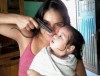 A fotografia mostra uma jovem sorridente apontando, o que parece ser uma pistola, diretamente para a cabeça, mais precisamente entre os olhos, de uma criança, com cerca de dois anos de idade.