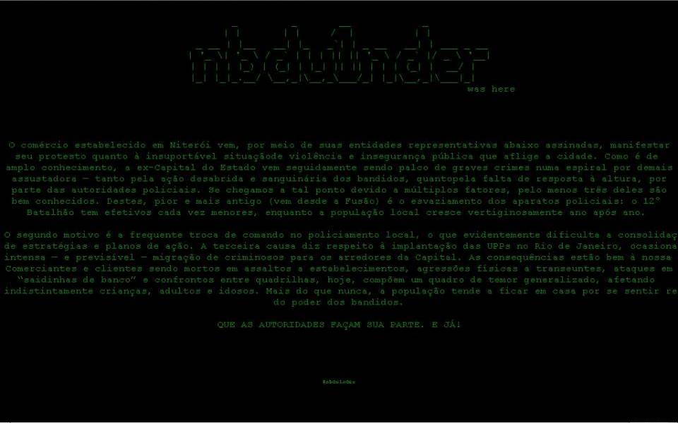 Ao acessar o site http://www.niteroi.rj.gov.br/ que é o site oficial da prefeitura aparece a mensagem em forma de protesto por parte dos comerciantes que estão cansados de tanta violência.
