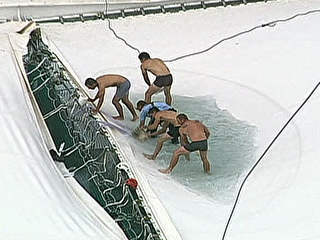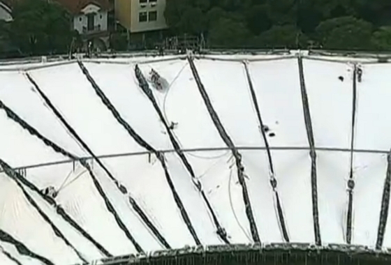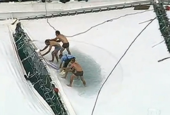 Na primeira forte chuva desde o início da instalação a cobertura ficou com água acumulada e trabalhadores precisaram tirar a água acumulada com balde na mão e sem equipamento de segurança .