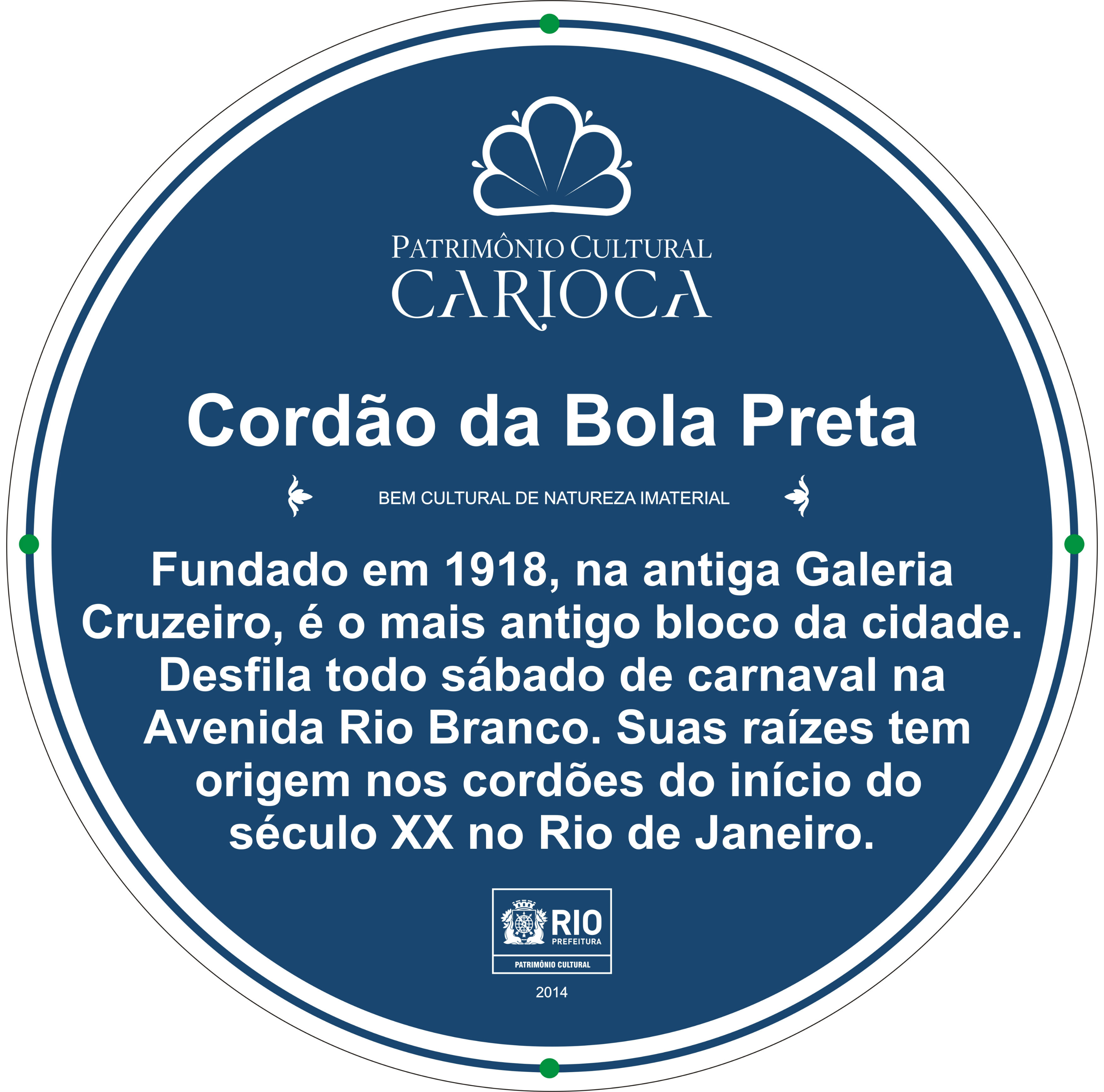 O Cordão da Bola Preta entra de vez para a história do carnaval e do Rio de Janeiro. Neste sábado (01/03), a Prefeitura do Rio, por meio do Instituto Rio Patrimônio da Humanidade (IRPH), entregará ao bloco mais antigo da cidade a placa que o identifica como um lugar importante para a história e memória do patrimônio cultural carioca. O presidente do IRPH, Washington Fajardo, fará a entrega da placa a Pedro Ernesto Marinho, presidente do Cordão da Bola Preta, antes do desfile do bloco na Avenida Rio Branco, entre 8h30 e 9h, na concentração, na esquina das avenidas Rio Branco e Presidente Vargas.  A placa será instalada na sede do bloco na Rua da Relação, na Lapa. Desde 2007, o Bola Preta é considerado patrimônio imaterial da cidade.