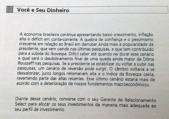 A análise foi impressa na última página do extrato dos clientes na categoria “Select”, com renda mensal superior a R$ 10 mil. Diz que se Dilma melhorar nas pesquisas de intenção de voto, os juros e o dólar vão subir e a Bolsa, cair.