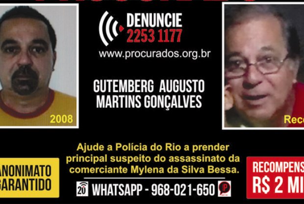 O Disque-Denúncia está oferecendo uma recompensa de R$ 2 mil por informações sosbre o paradeiro do advogado Gutemberg Augusto Martins Gonçalves, de 53 anos. Ele é o principal suspeito da morte de sua ex-esposa, Mylena da Silva Bessa, de 27, no último sábado, em Niterói, na Região Metropolitana. O órgão lançou nesta terça-feira um cartaz para ajudar na identificação do acusado.