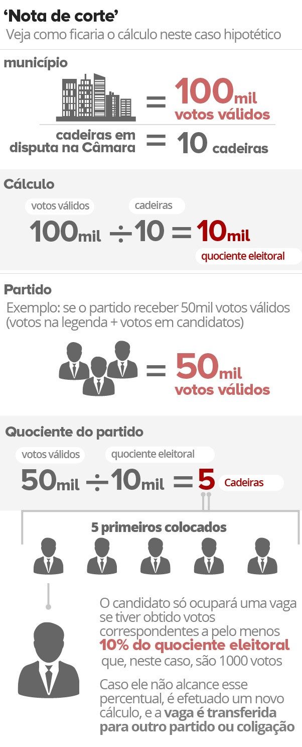 Um exemplo: se em determinado município, houve 100 mil votos válidos na eleição, e as cadeiras em disputa na Câmara são 10, o quociente eleitoral é 10 mil.