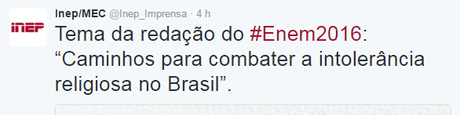 Guimarães diz que esperava que esse fosse o tema. “Acertei o tema da redação, foi o tema da avaliação do Sigma, do quarto perído do 3º ano do ensino médio, intolerância religiosa em questão no Brasil”, conta. “Esse tipo de discussão é fundamental, como foi no ano passado o tema da violência contra a mulher. São situações que geram debates público relevantes”, defende.