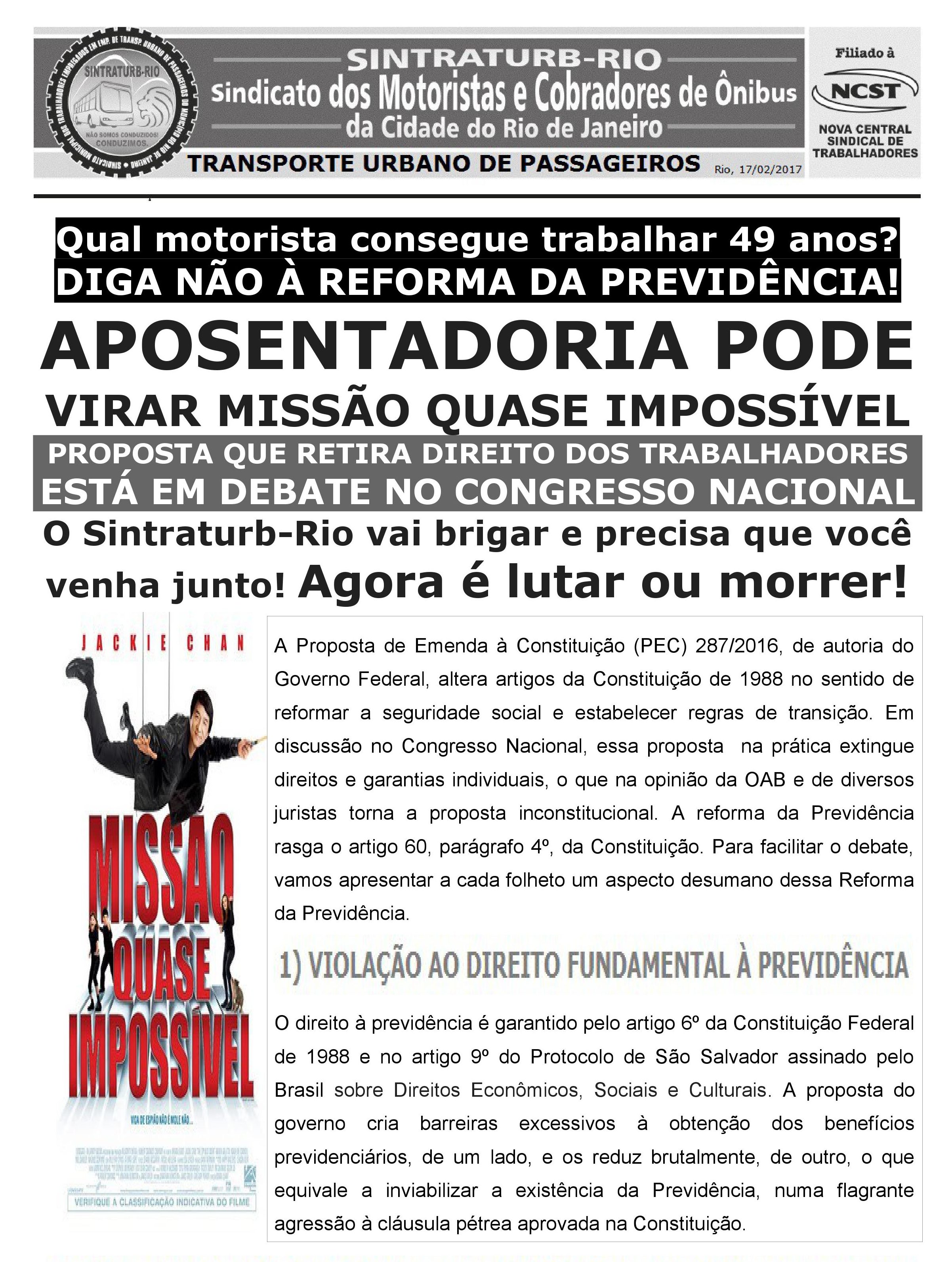 O Sindicato dos Motoristas e Cobradores de Ônibus do Rio de Janeiro (Sintraturb Rio) anunciou que a categoria fará uma paralisação de 24 horas a partir de 0h desta quarta, como forma de apoio aos protestos contra o projeto de reforma da previdência. Segundo nota do Sintraturb, participaram da assembleia cerca de 360 motoristas e cobradores de ônibus convencionais, BRT, fretamento, escolar e demais segmentos do setor de transportes.