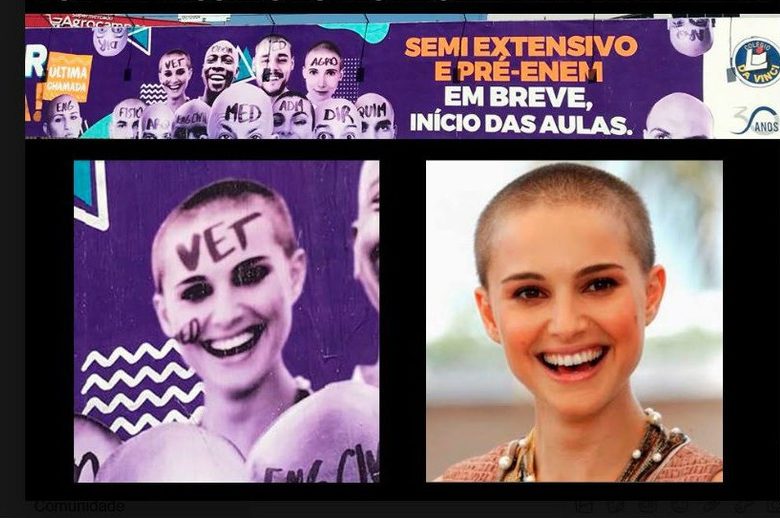 Uma imagem da atriz israelense-americana Natalie Portman como caloura de uma universidade viralizou nas redes sociais nesta semana. Um colégio particular em Patos de Minas (MG) divulgou em outdoors a propaganda de um curso preparatório para vestibulares com a foto dela.