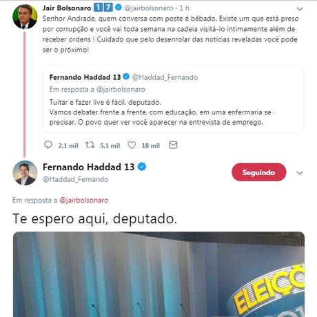 “Tuitar e fazer live é fácil, deputado. Vamos debater frente a frente, com educação, em uma enfermaria se precisar. O povo quer ver você aparecer na entrevista de emprego”, escreveu Haddad no twitter diretamente para Bolsonaro.