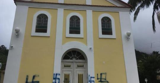 Pichações com a cruz suástica nazista em uma capela histórica de Nova Friburgo, na região serrana do Rio de Janeiro, indignaram moradores e se tornaram objeto de investigação da Polícia Civil fluminense. Os símbolos foram pintados entre a noite de sábado (13) e a madrugada de domingo (14) na fachada do templo católico, que tem mais de 150 anos.