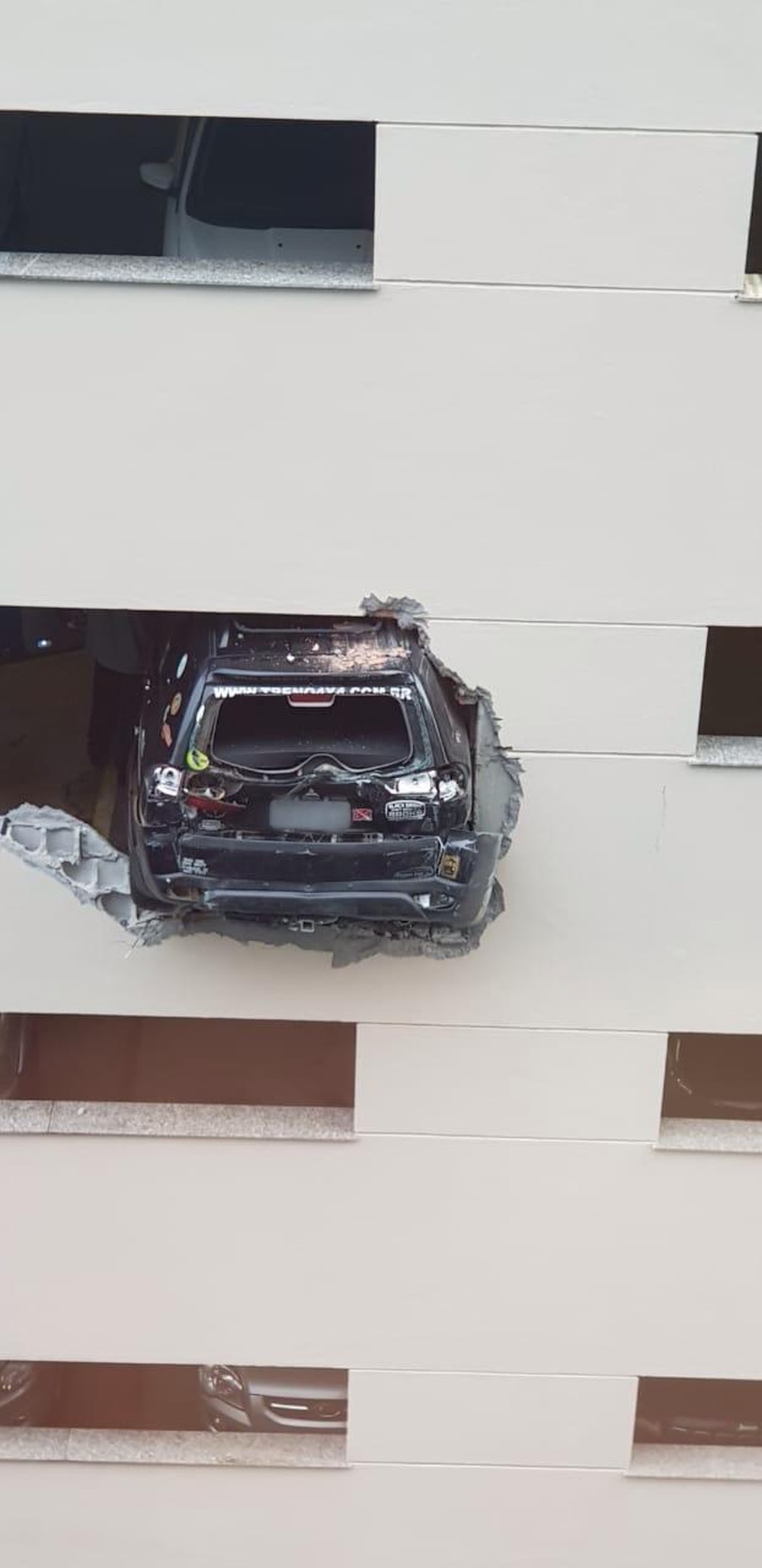 Carro bate em garagem e fica pendurado no Centro do Rio