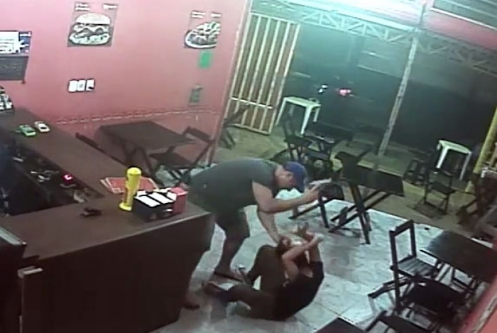 Logo após, o agente se aproxima do balcão, onde está Liz Pacheco Luiz, de 24 anos, arrasta a mulher pelo cabelo para fora da lanchonete. Com uma arma na mão, a todo o momento ele dá socos contra a cabeça dela, coronhadas, pontapés e vários chutes.