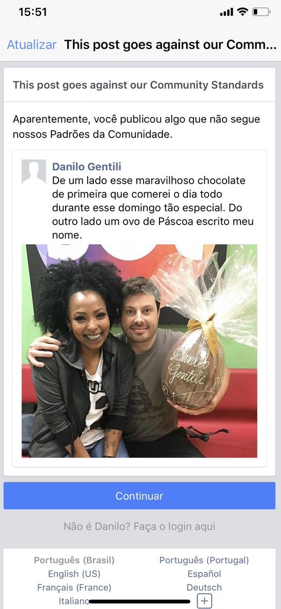 Por causa da piada, ele levou uma chamada daquelas da comunicação do Facebook. “Você está temporariamente bloqueado de enviar publicações. É um bloqueio temporário que durará sete dias. Você não poderá publicar no Facebook durante esse período. Se você publicar algo que viole os nossos padrões outra vez, sua conta será bloqueada por 30 dias. Se fizer isso outra vez, sua conta será bloqueada por um período ainda maior. Lembre-se: quem publica com frequência conteúdo proibido no Facebook pode ter a conta permanentemente desativada“, manifestou.