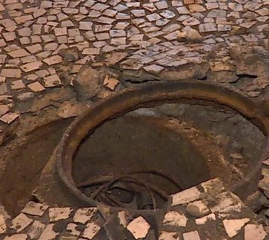A explosão levantou o bueiro e quebrou vários pedaços do chão.