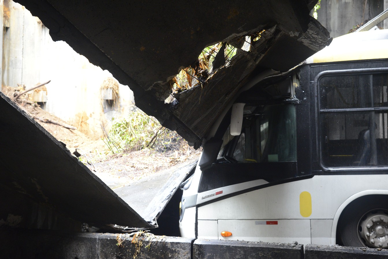 Um deslizamento de terra provocou no começo da tarde de hoje a queda de parte da estrutura do teto do Túnel Acústico Rafael Mascarenhas, que liga as zonas sul e oeste do Rio de Janeiro, no bairro da Gávea. Um ônibus foi atingido pela queda da estrutura e, segundo o Corpo de Bombeiros, ninguém se feriu. Os dois sentidos da via estão interditados. O prefeito Marcelo Crivella (PRB) pediu que moradores das zonas sul e oeste evitem sair de casa. Uma chuva intensa atinge a cidade desde o início da madrugada e, às 12h30, a prefeitura decretou estágio de crise em razão do prejuízo da mobilidade após o desabamento do teto do túnel. A classificação é a mais grave em uma escala de três que também contempla os estágios de normalidade e de atenção. Às 13h, o congestionamento chegou a 113 km na capital –às 14h30, o índice havia caído para 92 km.