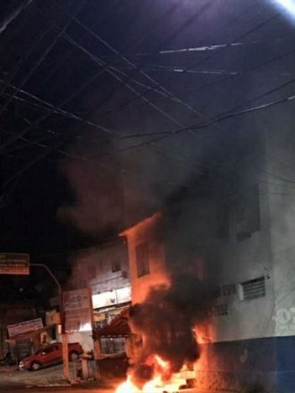 Base da Polícia Militar foi parcialmente incendiada, no início da noite desta segunda-feira, na comunidade do Caramujo, em Niterói, na Região Metropolitana.