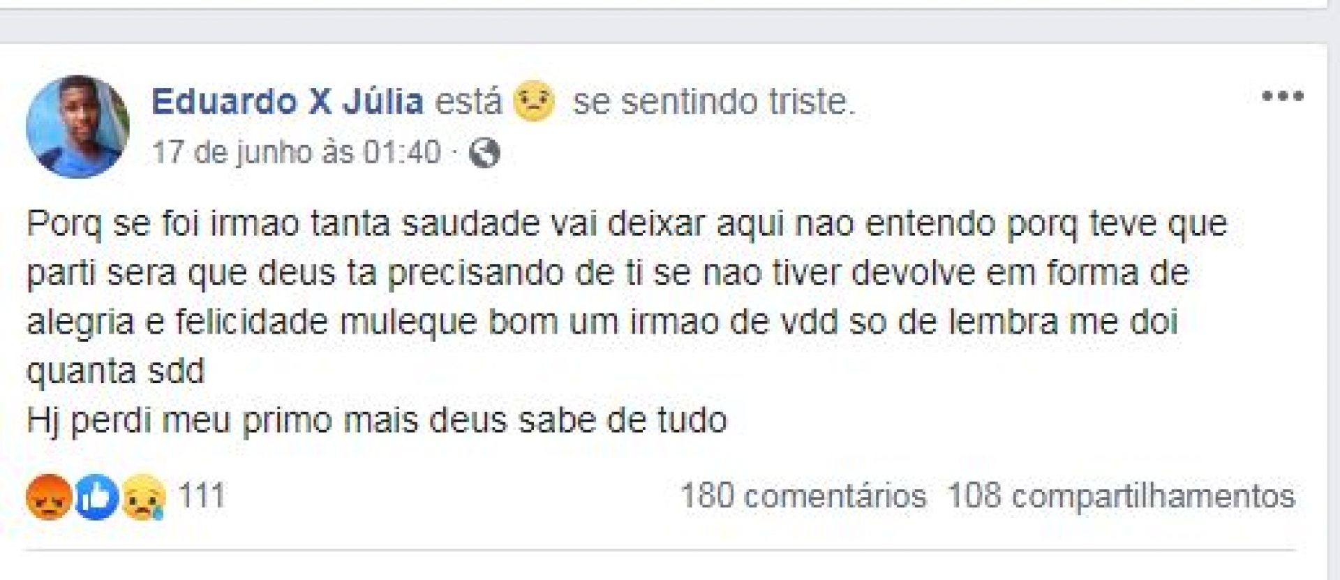 Na segunda-feira, quando o caso veio à tona, Fábio foi ao Facebook manifestar pesar pela morte do primo pequeno. No texto, ele pede que Deus devolva Mateus “em forma de alegria e felicidade”, e diz estar com saudades. Fábio também foi ao velório da criança e teria se comportado “normalmente”.