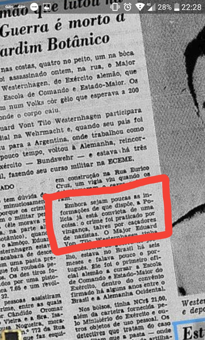 O Exército brasileiro homenageou nesta segunda-feira (1º) um major alemão que, durante a Segunda Guerra Mundial (1939-1945), defendeu o Exército nazista. De acordo com o texto publicado no site do Exército brasileiro, Eduard Ernest Thilo Otto Maximilian von Westernhagen (1923-1968) foi homenageado como aluno da Escola de Comando e Estado-Maior do Exército do Brasil. Em 1º de julho de 1968, enquanto frequentava a escola em um regime de intercâmbio, Otto foi assassinado a tiros no Rio de Janeiro em uma ação do grupo armado de esquerda Colina (Comando de Libertação Nacional). Os guerrilheiros, porém, pretendiam matar o capitão boliviano Gary Prado, que em 1967 havia participado da captura do líder comunista Che Guevara (1928-1967) na Bolívia. Prado, que tinha grande semelhança física com Otto, frequentava o mesmo curso do alemão na Escola de Comando e Estado-Maior do Exército brasileiro. Ao noticiar o assassinato de Otto, na edição de 2 de julho de 1968, a Folha de S.Paulo afirmou: “A vítima fora condecorada por Hitler quando da ocupação da França e recebera graves ferimentos quando do ataque do Exército soviético a Berlim. Terminada a guerra, permaneceu no Exército alemão, devido às suas qualidades de perito em artilharia”. Procurada, a assessoria de comunicação do Exército brasileiro não respondeu aos questionamentos até a publicação deste texto. Outro texto publicado nesta segunda-feira no site do
