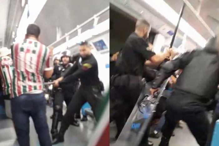 Seguranças que trabalham no Metrô Rio foram flagrados agredindo torcedores do Fluminense que voltavam do jogo do time tricolor contra o Corinthians no Maracanã, na noite desta quinta-feira. As imagens foram gravadas dentro de um vagão do transporte na estação que leva o nome do estádio, na Linha 2. Dois rapazes sofreram fraturas após serem atingidos com golpes de cassetete e ainda foram expulsos da estação.