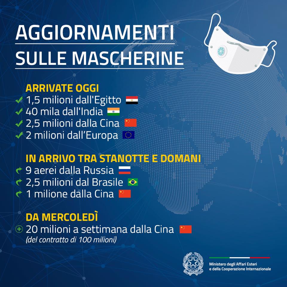 Um dia antes, Di Maio havia dito no Twitter que o Brasil enviaria 2,5 milhões de máscaras de proteção à Itália, que tem enfrentado escassez de equipamentos médicos por causa do sobrecarregamento de seu sistema de saúde em função do crescimento vertiginoso de casos do novo coronavírus.