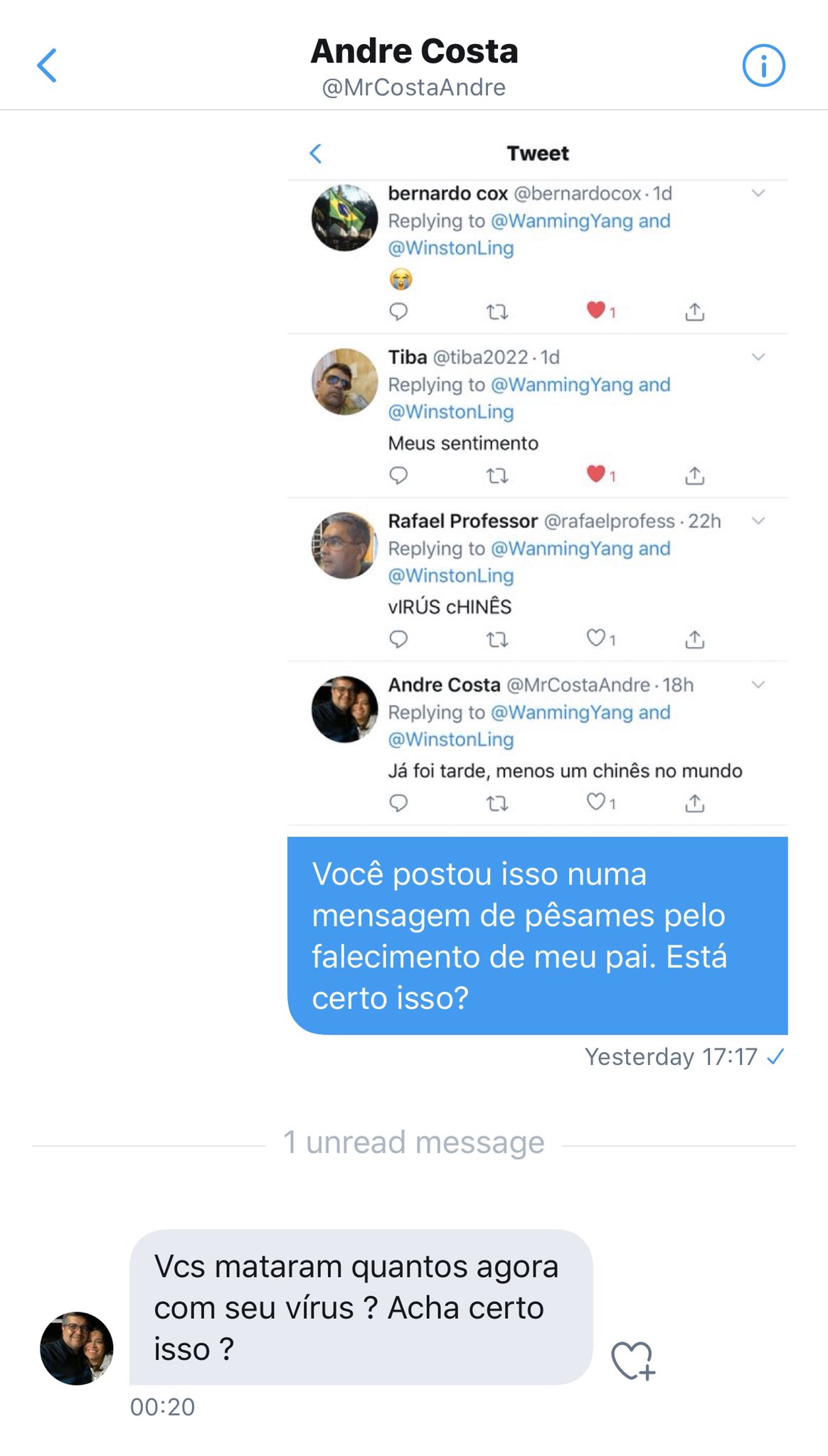 Winston Ling ainda recebeu outros comentários racistas, cujos autores se consideram anticomunistas e bolsonaristas. “Esse tipo de gente vai destruir o bolsonarismo”, afirmou ao expor as mensagens.