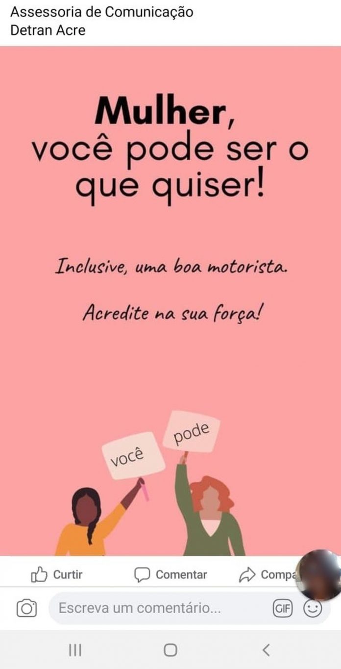 O Detran-AC iniciou a campanha durante a semana com mensagens de apoio e relatos de mulheres ao volante. A ideia, da postagem em específico, segundo o órgão, era apoiar as mulheres que têm medo de dirigir.
