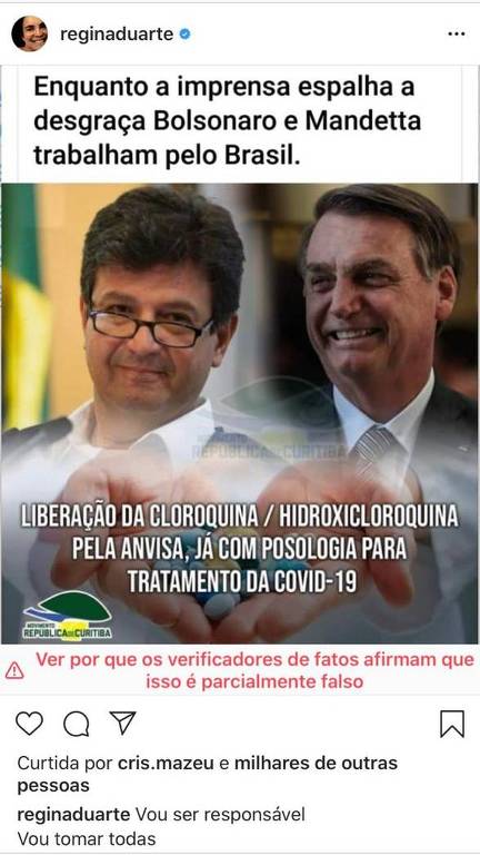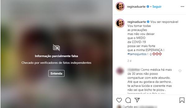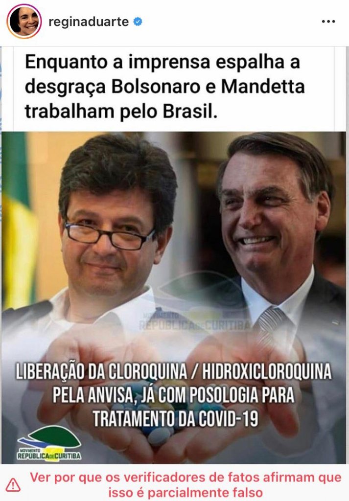 Uma postagem da secretária especial da Cultura, Regina Duarte, recebeu um aviso de “conteúdo parcialmente falso” no Instagram. O material foi publicado na última segunda-feira (30/3) e falava sobre o uso da cloroquina para tratar o novo coronavírus.
