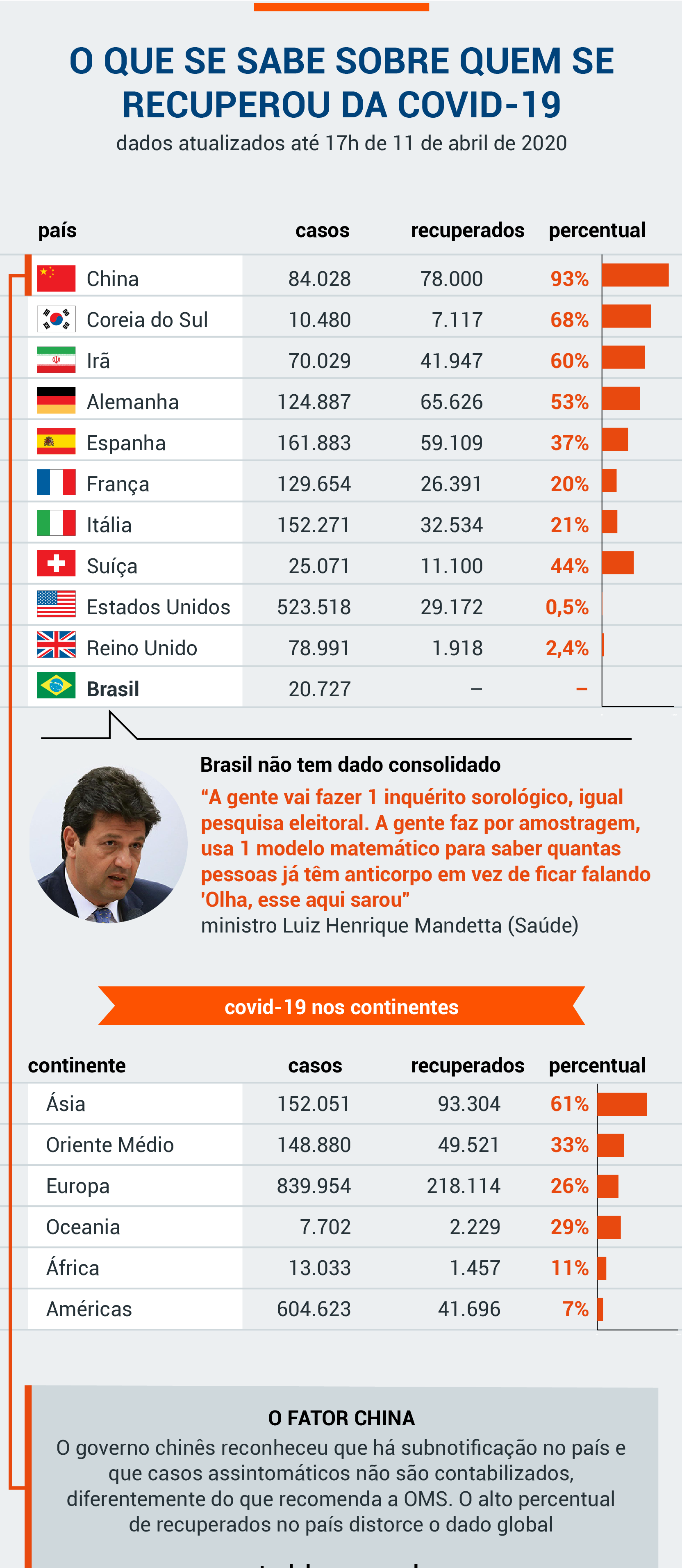 Os números, entretanto, são inflados pelos dados informados pela China, país com maior percentual de infectados que se recuperaram (93%). O governo do país asiático já reconheceu que há subnotificação de casos e que pacientes que não apresentam sintomas não foram incluídos no cálculo geral de pessoas infectadas. A prática contraria orientação da OMS (Organização Mundial da Saúde).