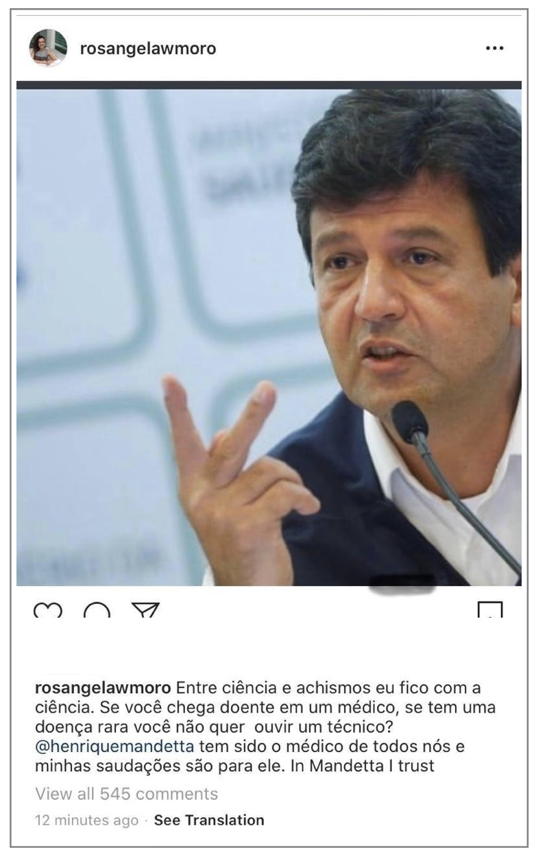 A advogada postou uma foto de Mandetta em seu perfil no Instagram e escreveu: “Entre a ciência e achismos, eu fico com a ciência. Se você chega doente em um médico, se tem uma doença rara, você não quer ouvir um técnico? Mandetta tem sido o médico de todos nós e minhas saudações são para ele.” Mais tarde, Rosângela apagou a postagem.