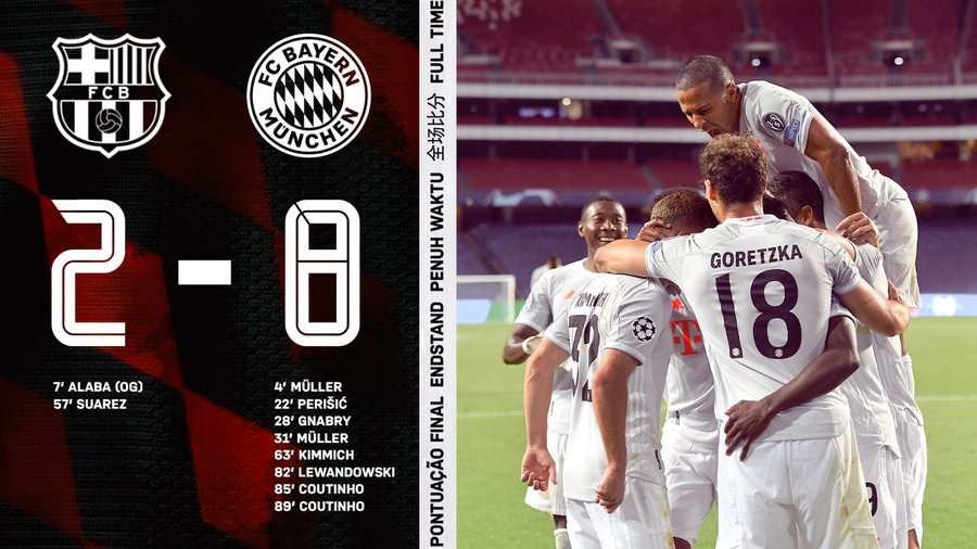 O Bayern de Munique protagonizou nesta sexta-feira (14) um dos maiores massacres da Liga dos Campeões, pois goleou o Barcelona por 8 a 2 em uma partida de quartas de final que entrou para a história da competição.