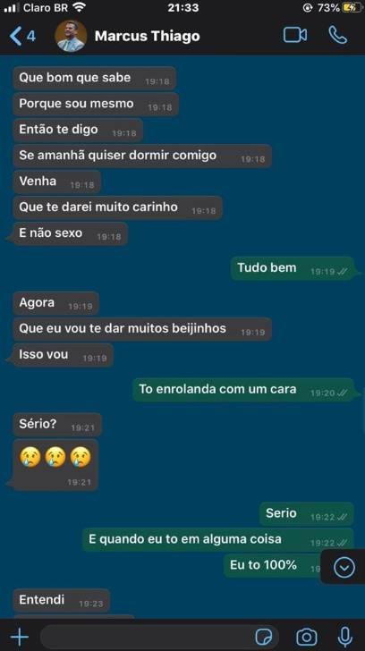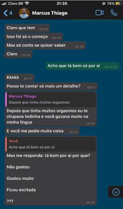 “Tive um sonho contigo que acordei achando que era real”, iniciou. Quando a moça pede para saber o conteúdo, o perfil atribuído ao gestor continua: “Foi gostoso”. Após um aparente desprezo pela história, o interlocutor insiste: “Depois que eu tinha muitos orgasmos, eu te chupava todinha e você gozava muito na minha língua. E você pedia muita coisa. Gostou? Ficou excitada?”, registra trecho do diálogo.