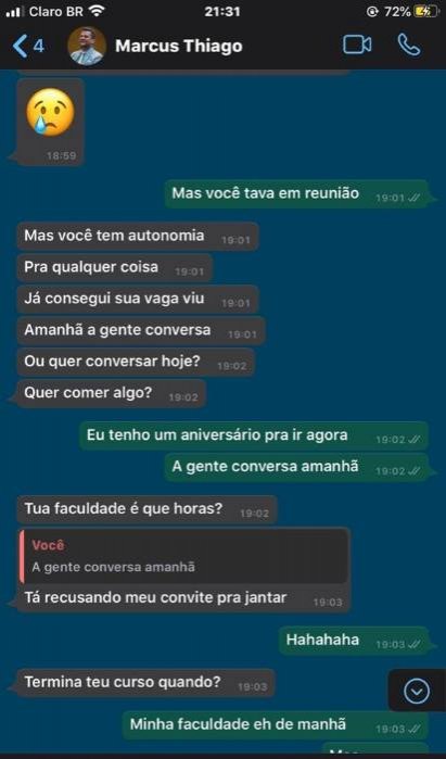 Em outro trecho, é possível identificar uma aparente sinalização de benesse no caso de a empreitada funcionar. “Já consegui sua vaga, viu? Quer conversar amanhã ou quer conversar hoje? Quer comer algo?”. Na resposta, a secretária recua do convite por mencionar uma festa de aniversário naquela noite.