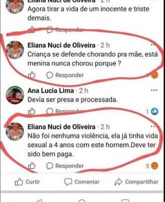 Em comentários em uma rede social, a docente Eliana Nuci de Oliveira escreveu: “Não foi nenhuma violência, ela já tinha vida sexual a (sic) 4 anos com este homem. Deve ter sido bem paga”. “Agora tirar a vida de um inocente é triste demais”, acrescentou a professora, referindo-se ao procedimento de interrupção de gestação ao qual a criança foi submetida.