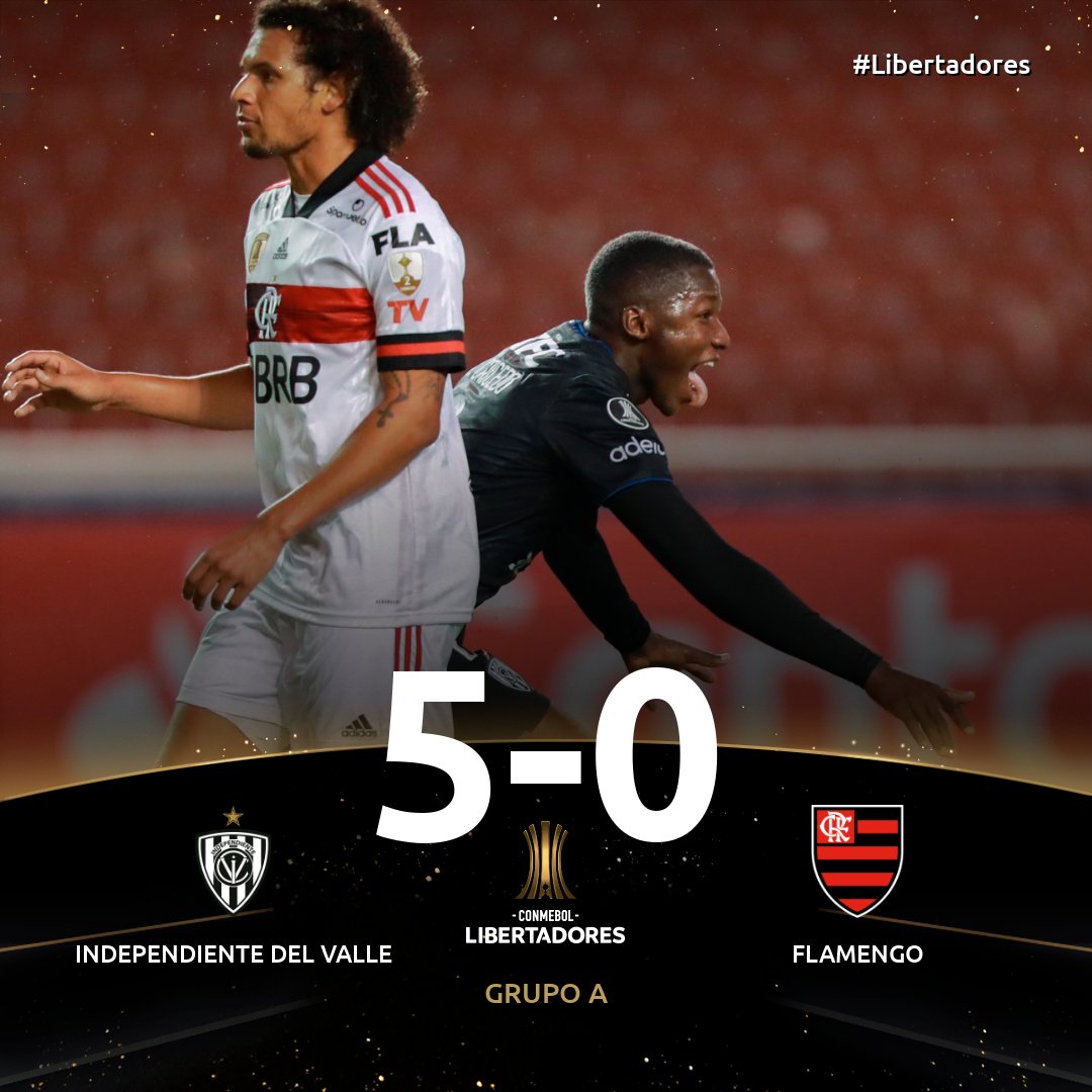 O retorno do Flamengo à Libertadores da América não foi nada bom. O Independiente Del Valle não tomou conhecimento do atual campeão e massacrou o Rubro-negro com uma vitória por 5 a 0, nesta quinta (17), no Estádio Casa Blanca, em Quito (EQU). Com o resultado, o time equatoriano chegou a 9 pontos e é líder isolado do Grupo A. O Flamengo permanece com 6 pontos, na segunda posição.