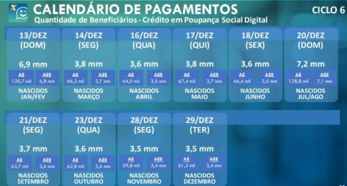 Já os nascidos em março receberão o auxílio emergencial nesta segunda-feira (14). Os pagamentos seguem durante todo o mês, até o dia 29 de dezembro, quando os nascidos em dezembro receberão o valor. Confira o calendário completo: