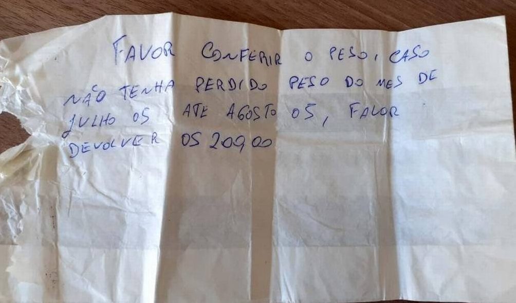 Bilhetes escritos pelo comerciante também mostram a cobrança para atingir o peso. “Quero ver o resultado no final do próximo mês, tá? Estou de olho. Este mês não vi diferença”, escreve em um deles. “Já chegou nos 90 kls? P/ mês que vem 85 kls!!! Combinado?”, questiona em outro recado.