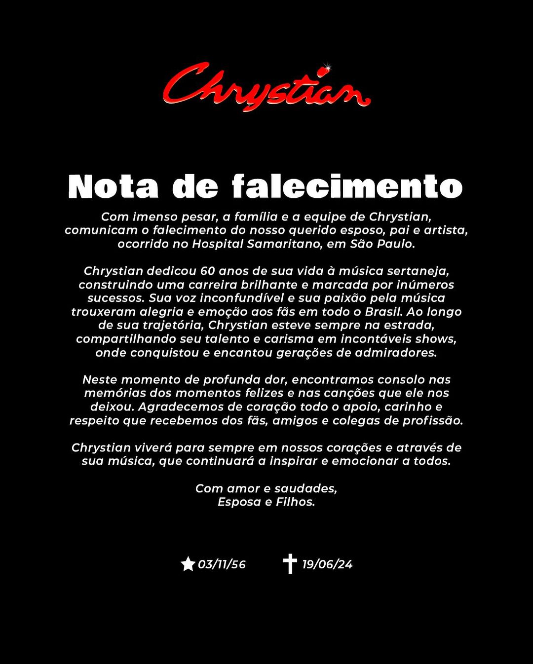 Em nota, a família de Chrystian agradeceu o apoio dos fãs e amigos e relembrou a dedicação do artista durante suas décadas de carreira.