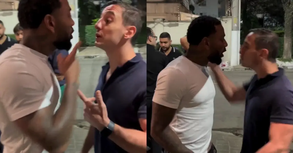 Após a chegada de Luiz Otavio, o cantor começou a gravar a briga. “Você não quer show?”, questionou o influenciador fitness. “Primeiramente, respeita os outros e vem aqui para fora”, rebateu Nego do Borel.
