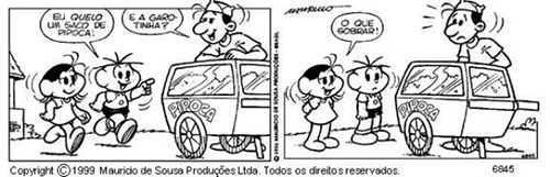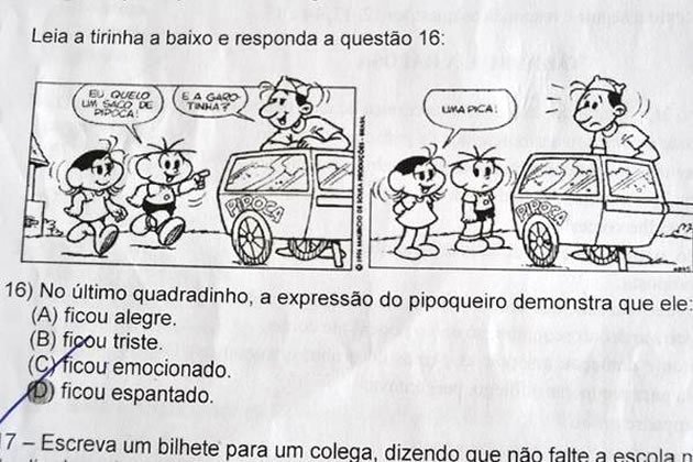 Na tirinha utilizada no teste, Magali e Cebolinha vão até um carrinho de vendas para comprar pipoca. Ao ser questionado sobre o que irá pedir, o personagem de cabelos espetados pede um saco da guloseima. Já a colega dele, conhecida por seu apetite insaciável, deveria pedir “o que sobrar” que estaria à venda, como no desenho original. No entanto, na figura reproduzida na prova, ela pede “uma pica”, em referência ao órgão sexual masculino.