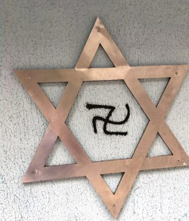 O rabisco lembra uma suástica, emblema do governo nazista alemão, que durante a Segunda Guerra Mundial matou milhões de judeus.