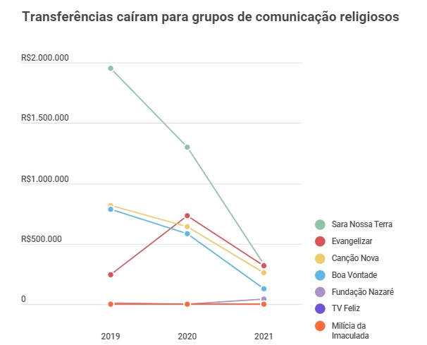A Sara Nossa Terra , rede de televisão de conteúdo evangélico com sede em Brasília, foi a que mais viu cair a sua arrecadação. Enquanto em 2019 os repasses da Secom chegaram a 1,9 milhões de reais, este ano o montante é até agora de apenas 331,1 mil reais. No ano passado, uma emissora irlandesa 1,2 milhão de reais.