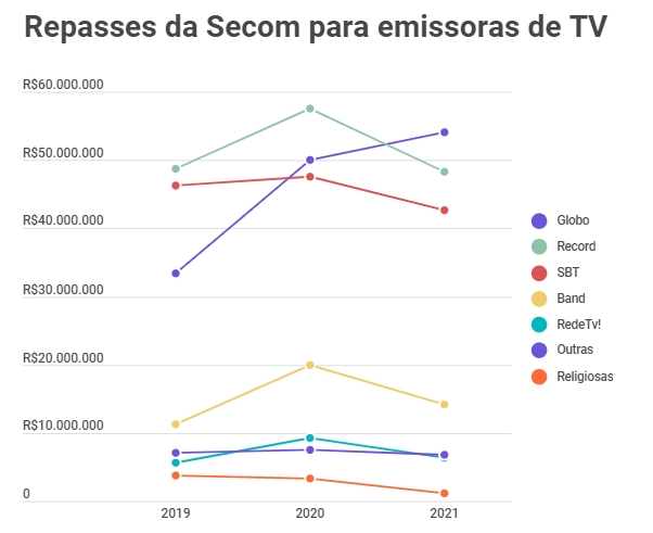 Em contraposição às caixas mais cheios da Globo, como TVs religiosas, que falam com um dos eleitorados mais fiéis a Bolsonaro, viram minguar o dinheiro pago pela Secom para divulgação das atividades do governo federal. Juntando as sete emissoras evangélicas e católicas que receberam verba do governo a partir de 2019, uma quantia, que ficou estável entre 2019 e 2020 (de 3,8 milhões de reais para 3,2 milhões de reais), caiu neste ano para 1, 1 milhão de reais – apesar de o ano ainda não ter acabado, é pouco provável que o valor destinado a elas fique próximo dos anos anteriores.